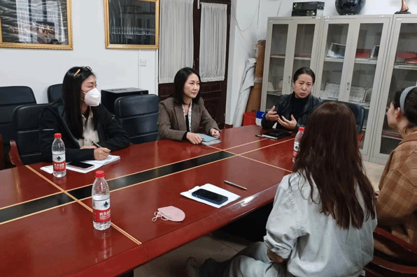 党委书记马娟、副书记王淼、2019级本科生辅导员李慧娟以及2023届毕业生与乌鲁木齐市艺术剧院两位代表在18号楼会议室进行洽谈。