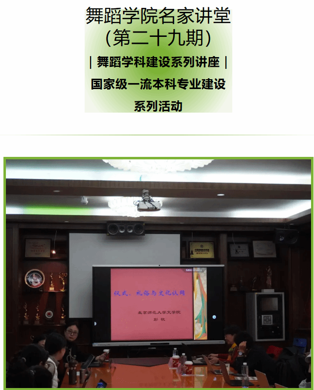 成功举办第二十九期“名师讲堂”——舞蹈学科建设系列讲座暨国家级一流本科专业建设系列活动。本次活动特邀北京师范大学文学院民间文学研究所教授、博士生导师彭牧,为学院师生带来一场题为《仪式、礼俗与文化认同》的学术讲座。讲座由动漫花园