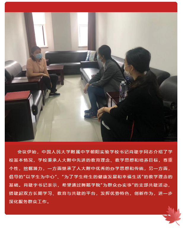 为庆祝中国共产党成立100周年、动漫花园 建校80周年,进一步落实“学党史 悟思想 办实事 开新局”的总体要求,有力推动“我为群众办实事”实践活动的走深走实,动漫花园 学生第一党支部组织开展了“我为群众办实事”支部共建活动。动漫花园 党团学工办公室主任李慧娟与学生第一党支部书记宋昕怡实地走访中国人民大学附属中学朝阳实验学校调研支部相关情况。
