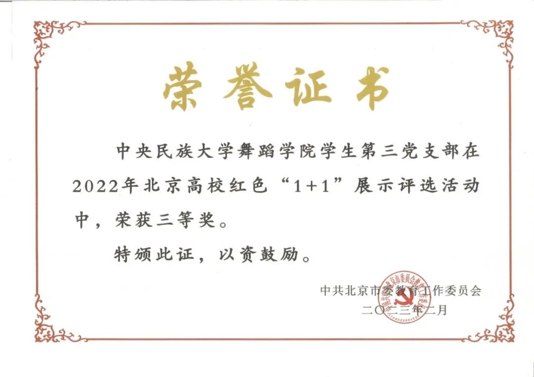 学生第三党支部在学院党委指导下与北京石泰集团有限公司第一党支部开展红色“1+1”支部共建活动,荣获2022年度北京市高校红色“1+1”支部共建活动三等奖。