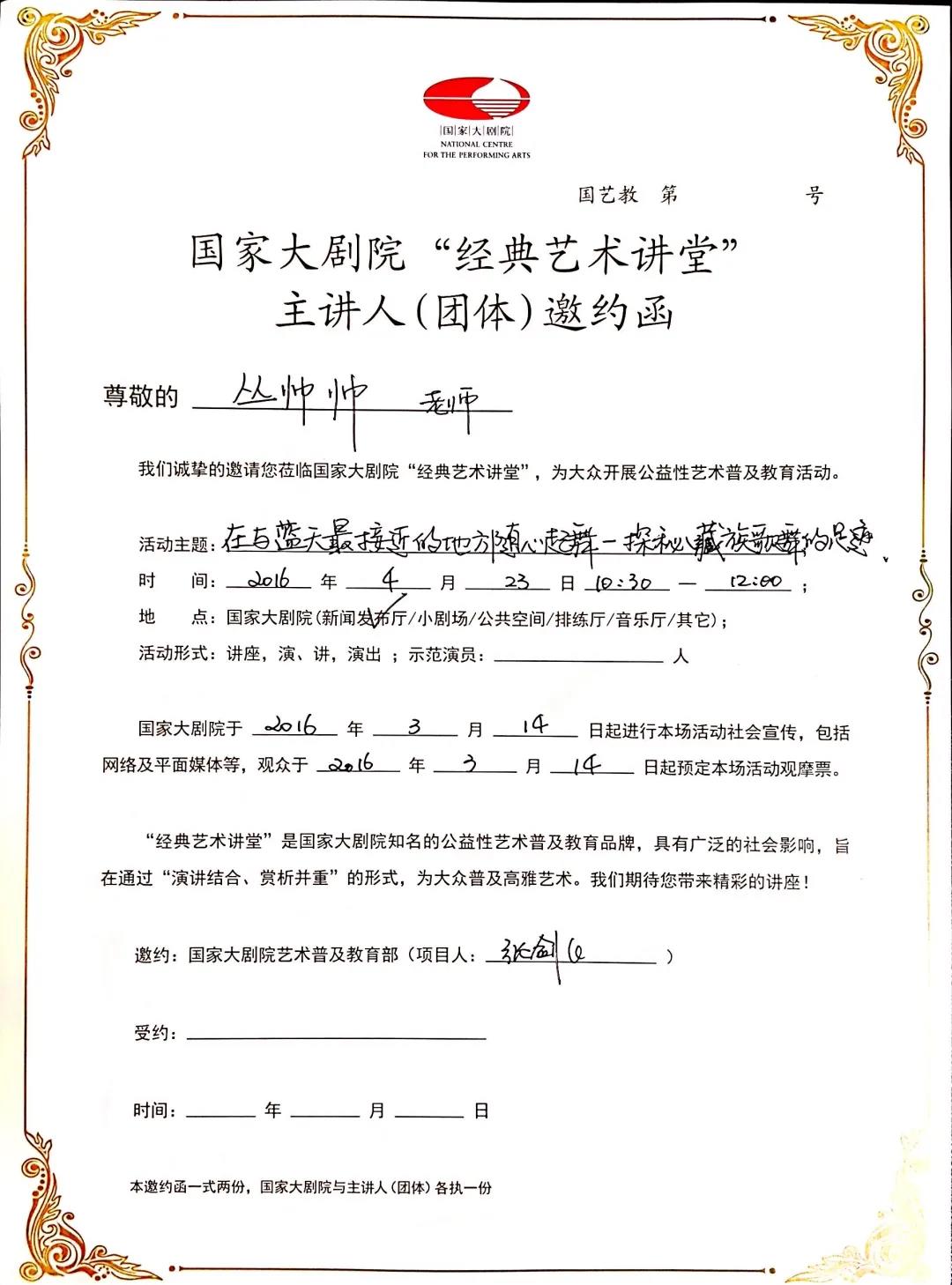 受中国舞蹈家协会、国家大剧院等邀请,主讲《深扎在路上》、《在与蓝天最近的地方随心起舞——探秘藏族歌舞的足迹》、《民族舞蹈从乡土走向殿堂——以藏族舞蹈“谐”为例》等讲座。