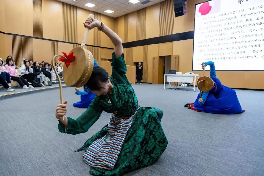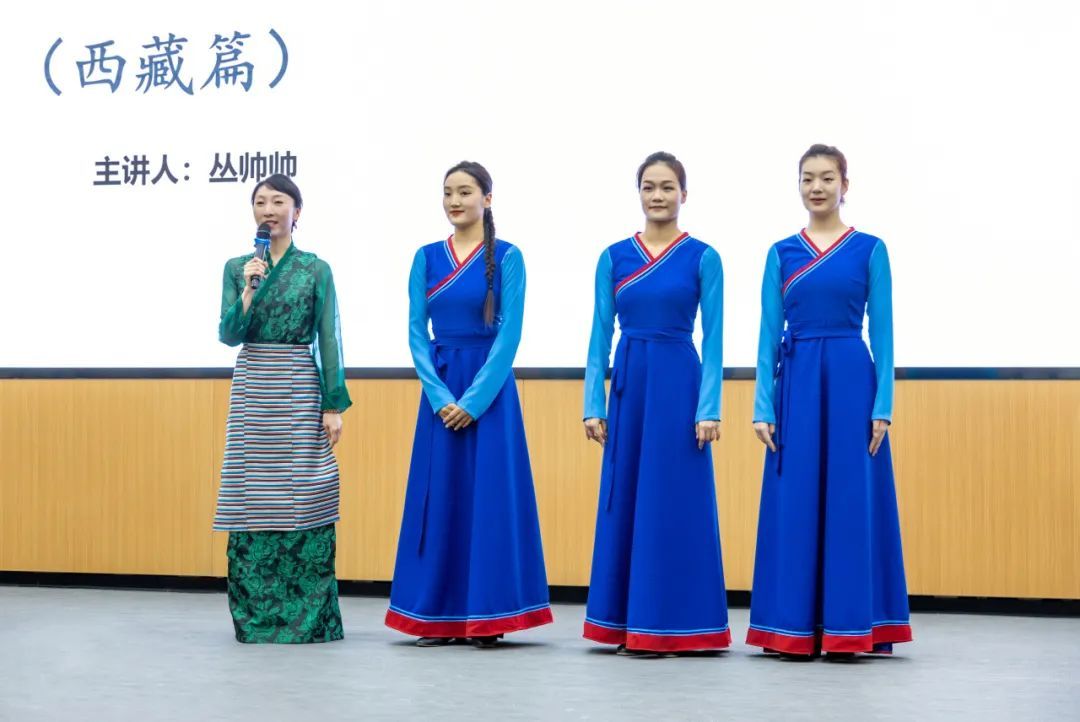 本期讲座中,两位老师分别讲解了藏族、蒙古族舞蹈文化背景和风格特点,丛帅帅老师主要讲授了藏族舞蹈的种类和分布,并对“堆谐”“弦子”“热巴”三种不同的舞蹈风格进行了详细的讲解和赏析。铁木尔老师带领大家在不同风格的蒙古族舞蹈中体会蒙古族人民的积极向上、热情豪迈及蒙古族舞蹈的悠然自得、刚柔并济。让大家在讲座中能够更好地理解“各美其美,美美与共”的内涵,构筑中华民族共有精神家园,积极培育铸牢中华民族共同体意识。