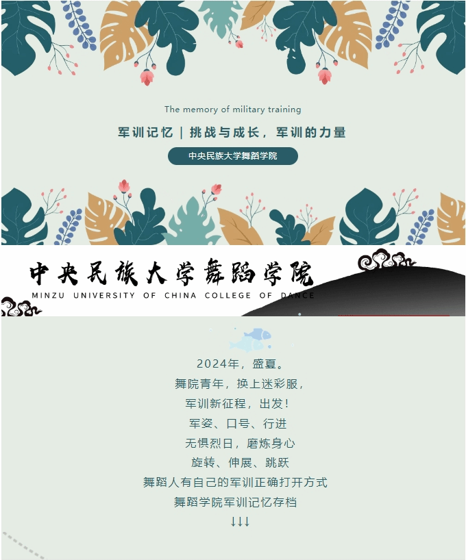 舞动青春,铸就军魂!舞院学子在军训场上挥洒汗水,热血舞蹈!以舞者的优雅与军人的坚毅共谱篇章。我们在这里锤炼意志,塑造体魄,用舞蹈的语言诠释纪律之美。民大舞院学生们,一起在严谨与灵动间绽放光彩!
