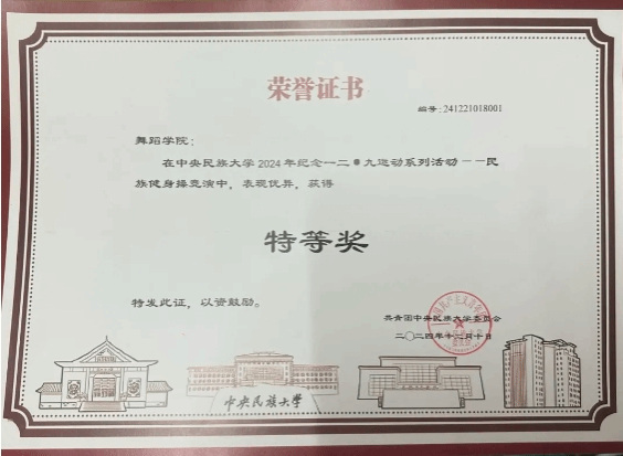 由团委书记赵子嘉、本科辅导员周垠廷老师带队,经过不懈努力和刻苦的排练,于12月4日在纪念“一二·九”运动系列活动—民族健身操竞赛中荣获特等奖。