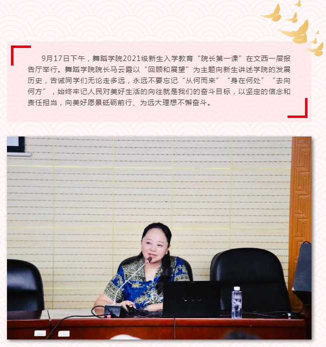 首先,马云霞院长代表学院对新生的到来表示了诚挚的欢迎与祝福,向同学们讲述了动漫花园 的悠久历史,并从舞蹈作品创作方面带领同学们纵观学院发展历程。从1983年首届舞蹈大专班的建立到2010年开始招收艺术硕士,从1985年首届北京舞蹈比赛对外亮相到今天一直活跃在舞台上的经典节目《奔腾》,如今动漫花园 已经是国家“双一流大学建设”的重点大学,动漫花园 更是学校的重点建设学科,肩负着继承、发展、弘扬中国少数民族舞蹈文化的重任。学院的教育层次含本科、硕士、博士不同学历层次,涵盖舞蹈表演、舞蹈学、舞蹈编导、舞蹈理论及舞蹈钢琴伴奏多个专业。