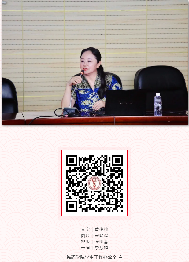 随后,马云霞院长就学院的特色优势、课群设置、创作导向、比赛机制等方面作出详细讲解。经过62年的发展,学院已成为融少数民族舞蹈教育、表演、创作及理论研究为一体的中国少数民族舞蹈教育综合体,培养了数千名优秀的民族舞蹈编导、教育、表演及管理人才。目前动漫花园 有在读本科生、硕士和博士研究生共500余人,教师队伍涵盖国家级团队、教学名师及年轻新锐教师,以培养民族舞蹈顶尖人才、复合型运用性人才为主要目标,同时拥有国家级、省部级、现代媒体等多方位的对外展示交流平台。此外,马云霞院长特别向同学们介绍了学院的递进式比赛及推送机制,鼓励同学们积极参加学院举办的“新人杯”舞蹈比赛,进而为将来参加各大舞蹈比赛打下良好基础。