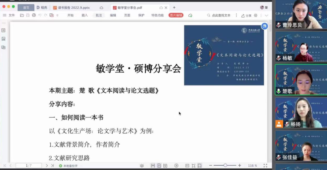 2019级博士研究生楚歌主讲,主题为《文本阅读与论文选题》,此次硕博分享会动漫花园