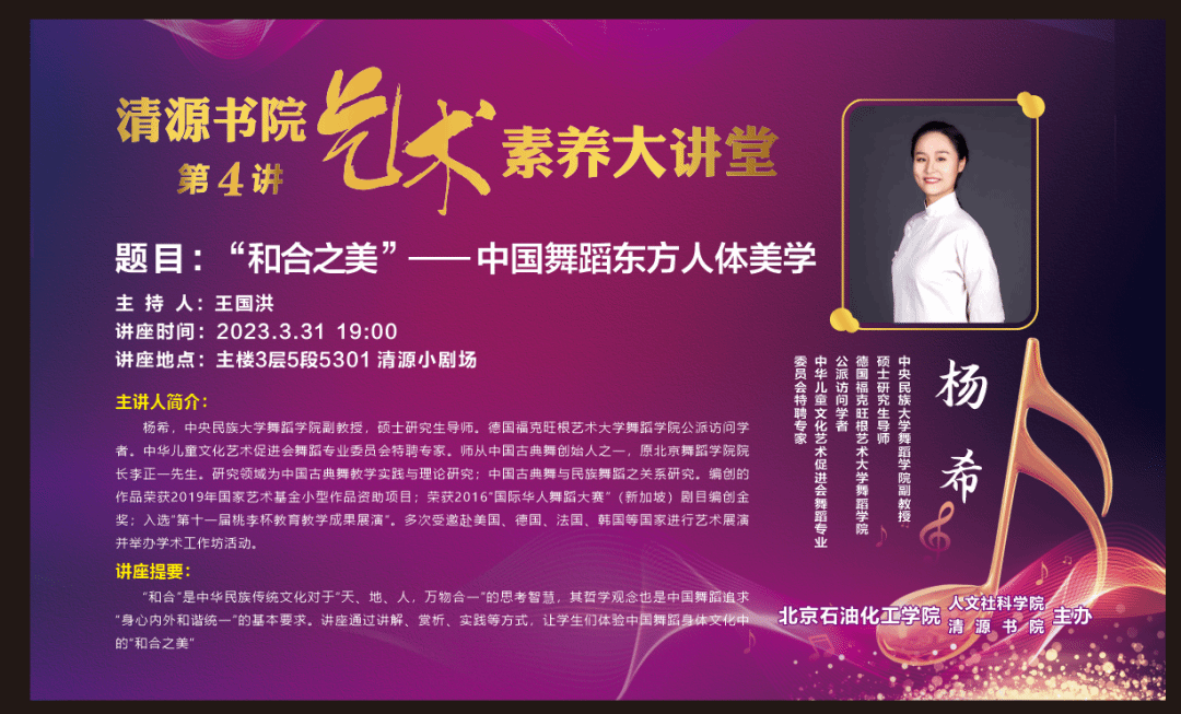 非常有幸可以跟随杨希老师参加此次“和合之美”——中国东方人体美学的讲座。此次讲座使我对中国民族舞蹈美育教育的普及有了更加清晰的认知和了解。