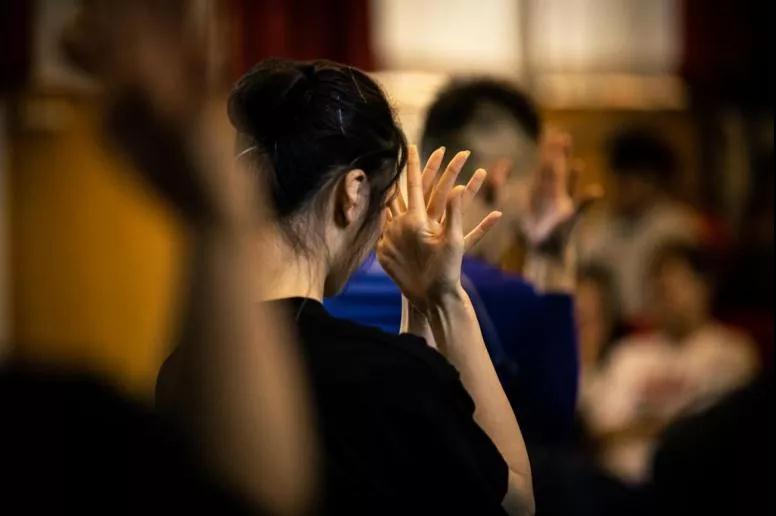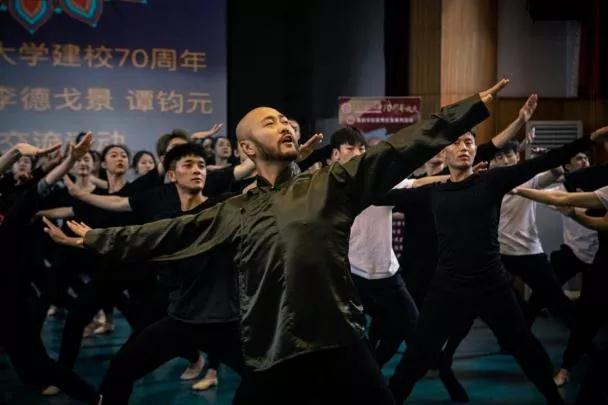 接下来是互动教学环节。首先谭钧元分别讲解了作品动作中的身体部位和节奏,强调了点与线的关系,重拍强弱与气息的融合。亲身示范,手把手传授表演经验。不同于传统傣族舞蹈动作,该作品在动作编排上进行了大胆创新,充分调动身体小关节的灵活度,同时加大了舞者对快节奏与身体协调性的掌握难度。