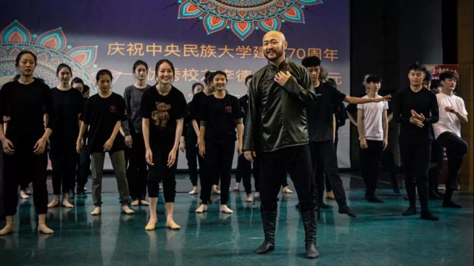 第二部分,2005级校友李德戈景讲授蒙古族舞蹈。他以风格教学为主,利用动感的音乐让学生们感受蒙古族人驰骋草原的豪迈自如。他的教学简而有序,以蒙古族硬腕为切入点,强调小关节的细节把控,根据学生的学习进度,逐渐加入舞蹈步伐。