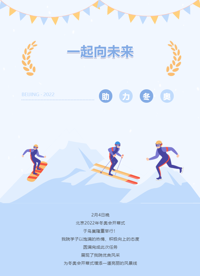 首先,热烈祝贺北京2022冬奥会开幕式圆满成功,同时预祝冬奥会闭幕式、残奥会开幕式及闭幕式圆满成功。作为冬奥会开幕式的一名编导,我很荣幸能够拥有这样一次历练的机会,同时也要感谢学校对我的培养。