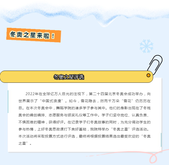此次闭幕式参演活动,舞院学子不畏严寒、不辞辛苦,义无反顾地完成每一次的排练任务,展现了舞院学子朝气蓬勃、意气风发的精神面貌,留下了舞院学子坚韧不拔、自信的身影,为第二十四届冬奥会闭幕式注入了舞院学子积极向上的青春热血。