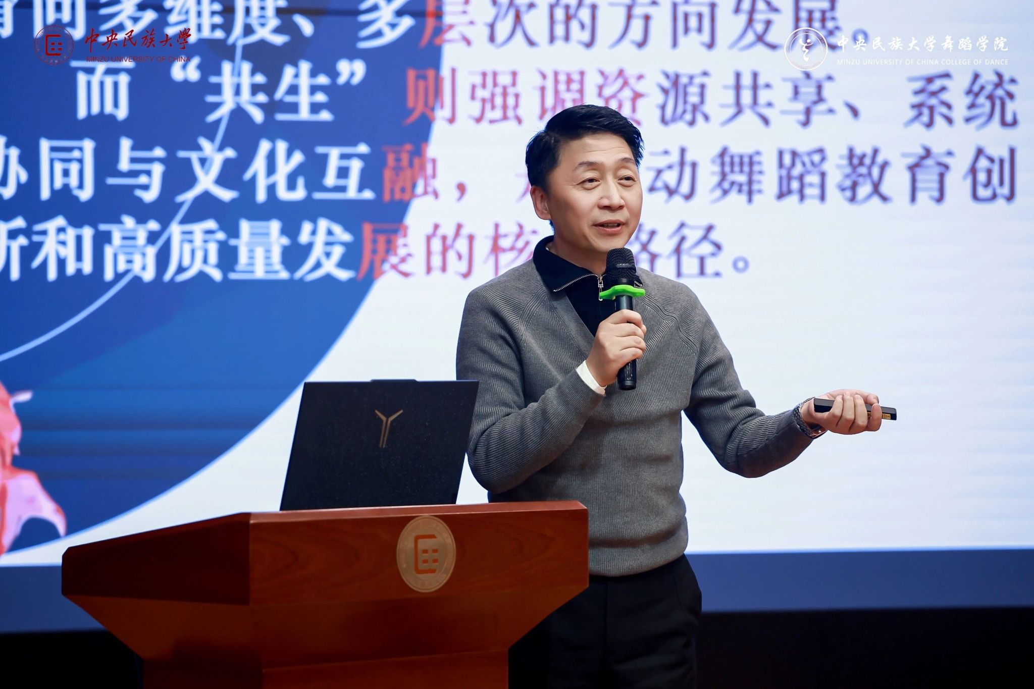 党总支书记、院长、博士生导师张麟教授以《舞蹈表演人才培养中身体表现能力的多元开发路径研究》为主题进行分享,指出身体表现力是舞蹈表演的核心,其高低决定了表演水平。通过动作分析和动作构型课程开发身体思维,培养舞者对身体自我舞动的了解和实时操控;通过戏剧表演课程转型和身体语义表达机制建设,激活演员善于表达、用肢体言说的意识;通过身体控制层面训练,提升舞者对自我身体部位、肌肉等的综合操控能力;通过乐感浸润层面训练,强化舞者对音乐色彩的动态感知和音乐织体结构的动态设计。此外,AI技术在舞蹈表演训练中具有应用潜力,通过AI数据比对与反馈分析,能够助力舞者身体表现力的科学化提升。与此同时分享了具体的身体表现力开发训练方法。