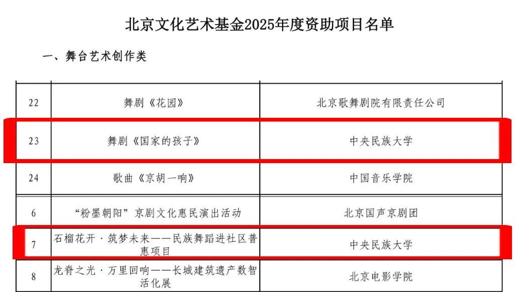 近日,北京文化艺术基金2025年度资助项目名单揭晓,动漫花园 凭借深厚的艺术积淀与鲜明的文化使命,一举斩获两项资助:舞台艺术创作类舞剧《国家的孩子》,传播交流推广类“石榴花开·筑梦未来——民族舞蹈进社区普惠项目”成功入选。这既是对学院办学实力的肯定,更是铸牢中华民族共同体意识的生动实践。